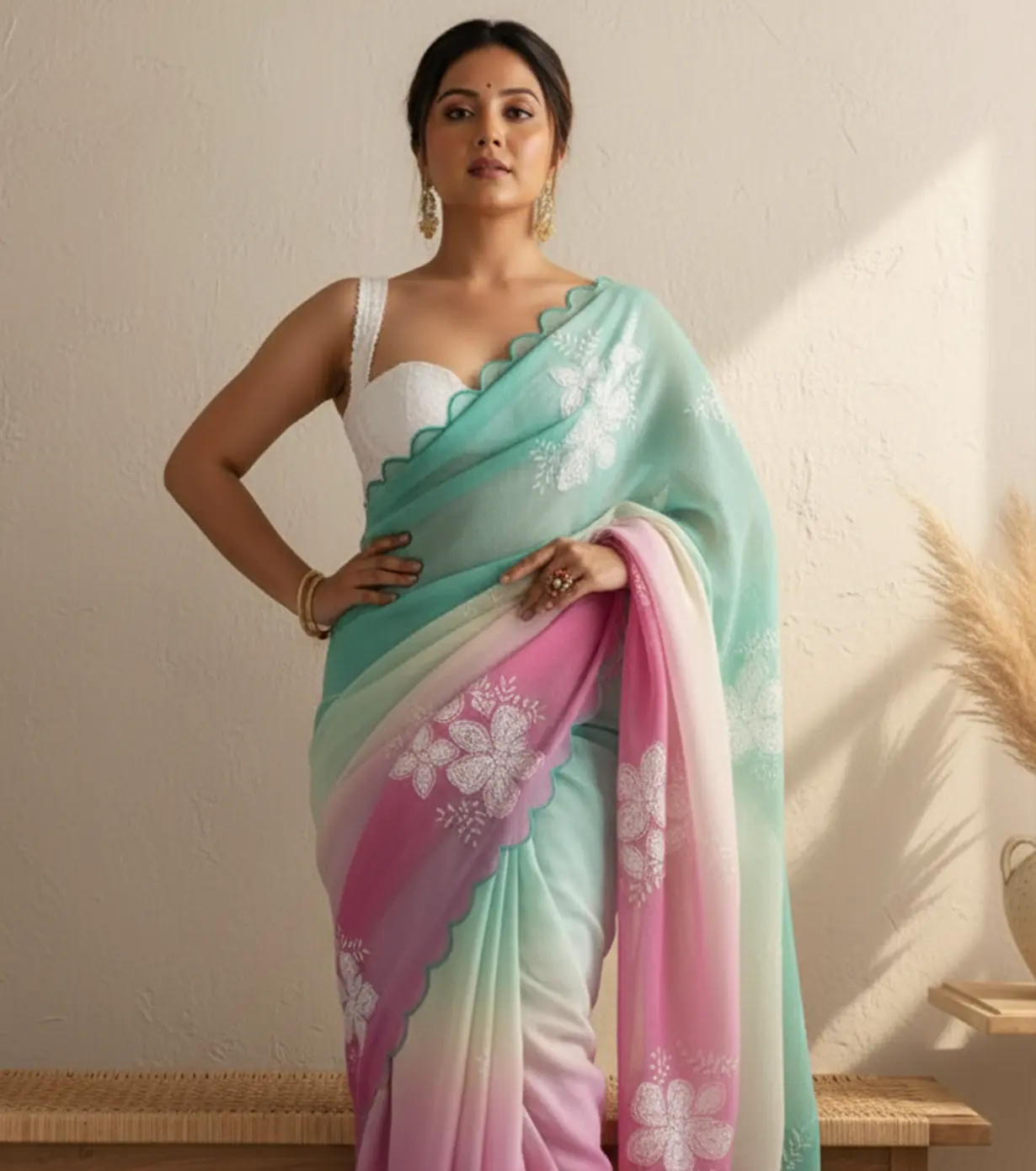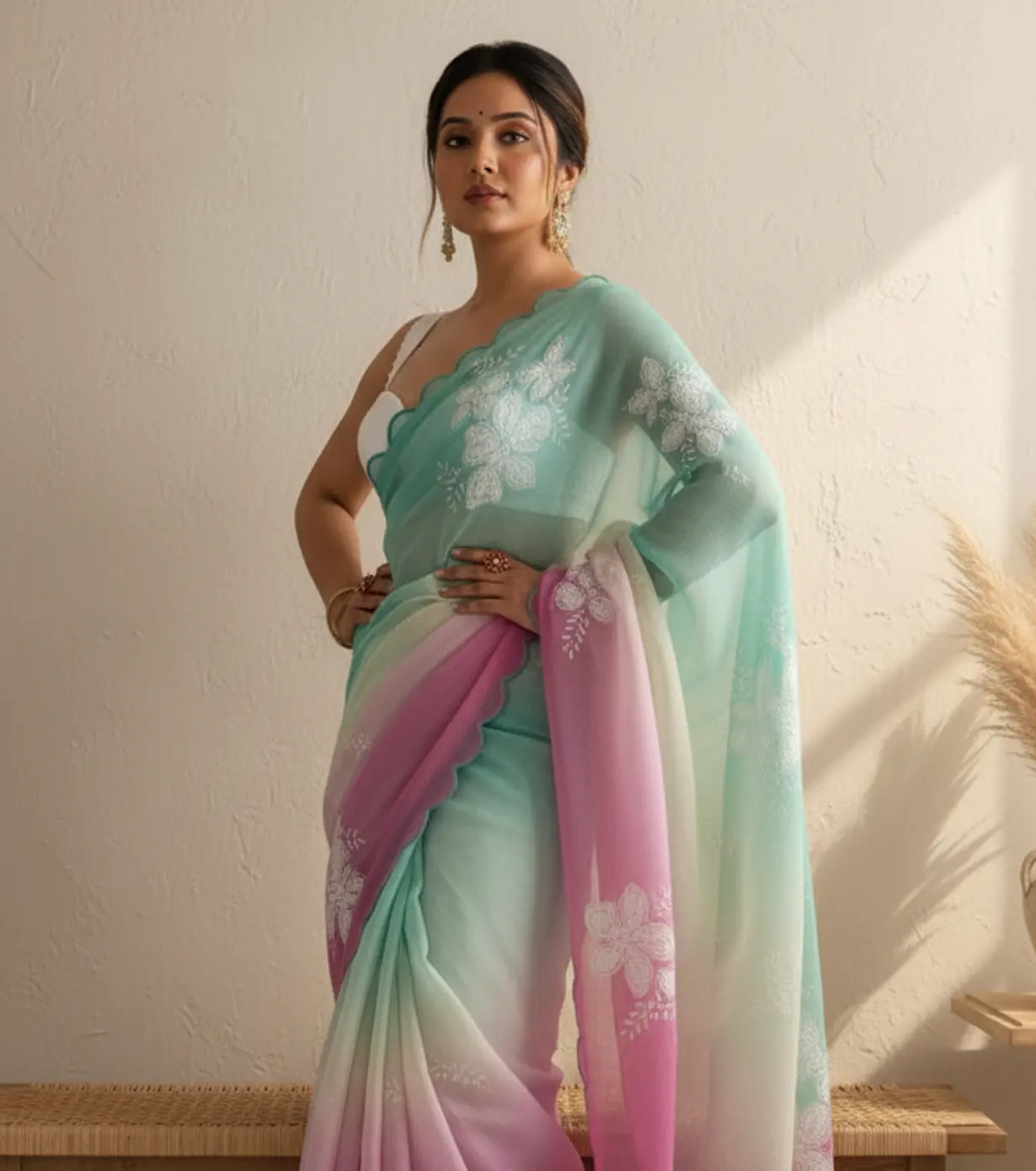Elegant saree crafted from super-fine trendy crunchyped­ing fabric, adorned with heavy cotton thread embroidery throughout, paired with a matching blouse piece, offering timeless style and refined sophistication for special occasions.