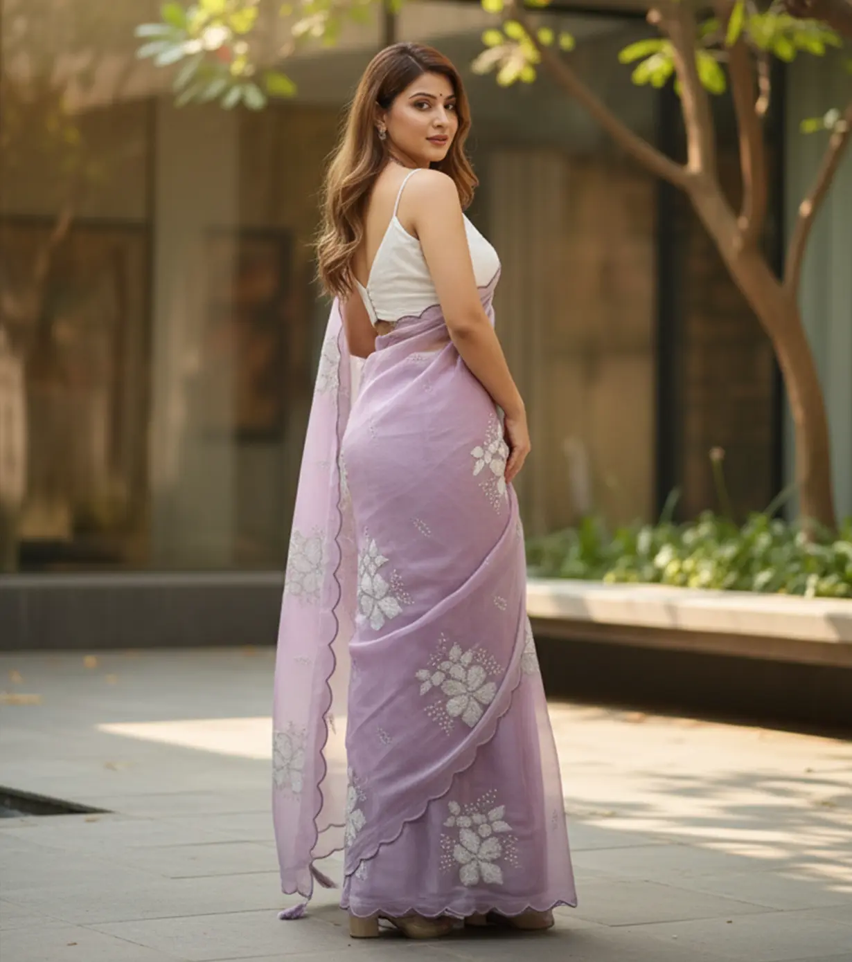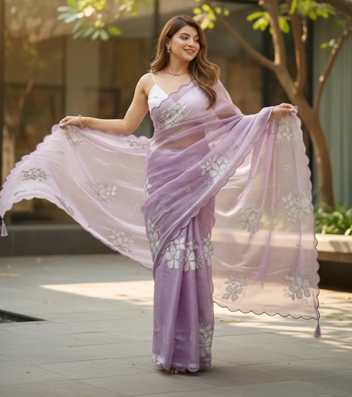 This Jimmy Choo fabric saree features heavy embroidery with digital print accents, offering a luxe finish. Includes blouse piece within 6.30 m cut; elegant drape with dry-clean care recommended always.