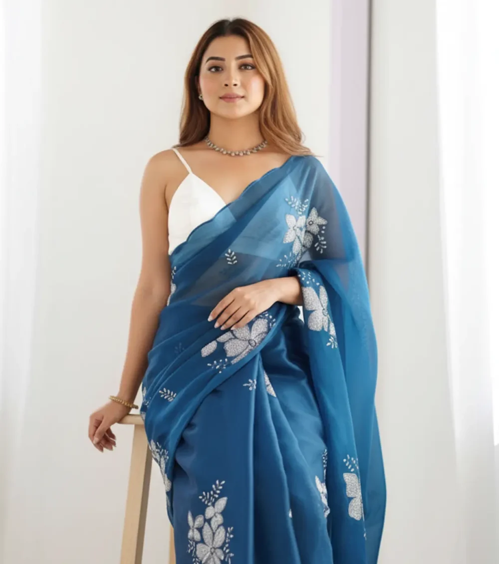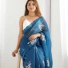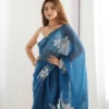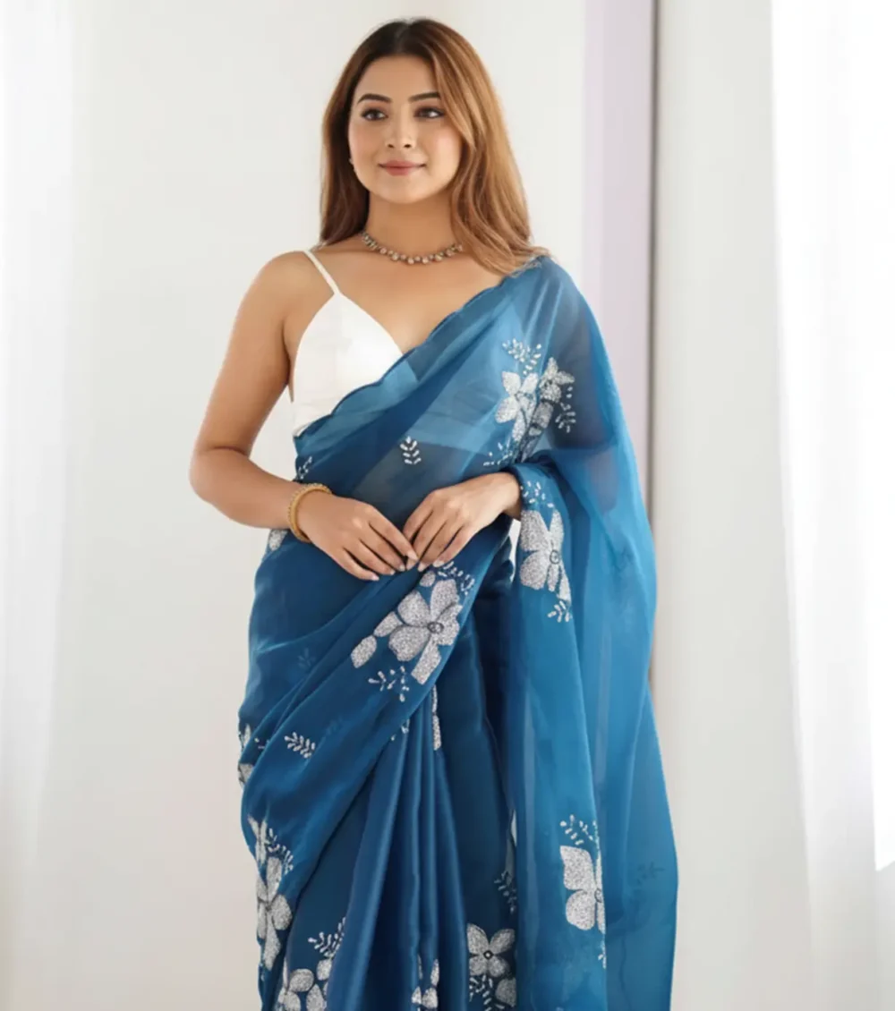 Elegant and refreshing, this azure blue saree in premium Jimmi Choo fabric features delicate floral motifs and a soft, sheer drape. The lightweight texture ensures comfort while flowing beautifully. Perfect for festive occasions or elegant outings, it blends cool tones with a subtle shimmer for a graceful look.