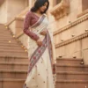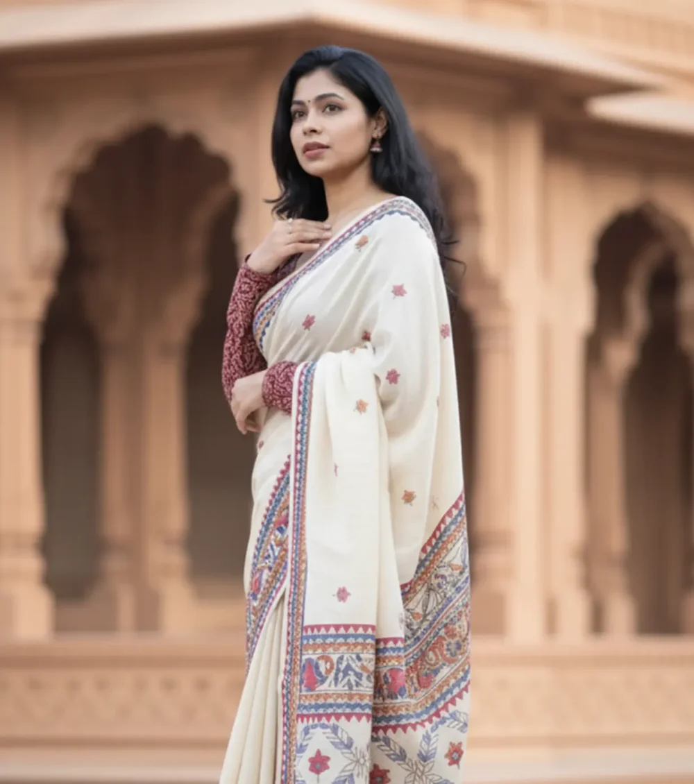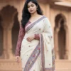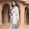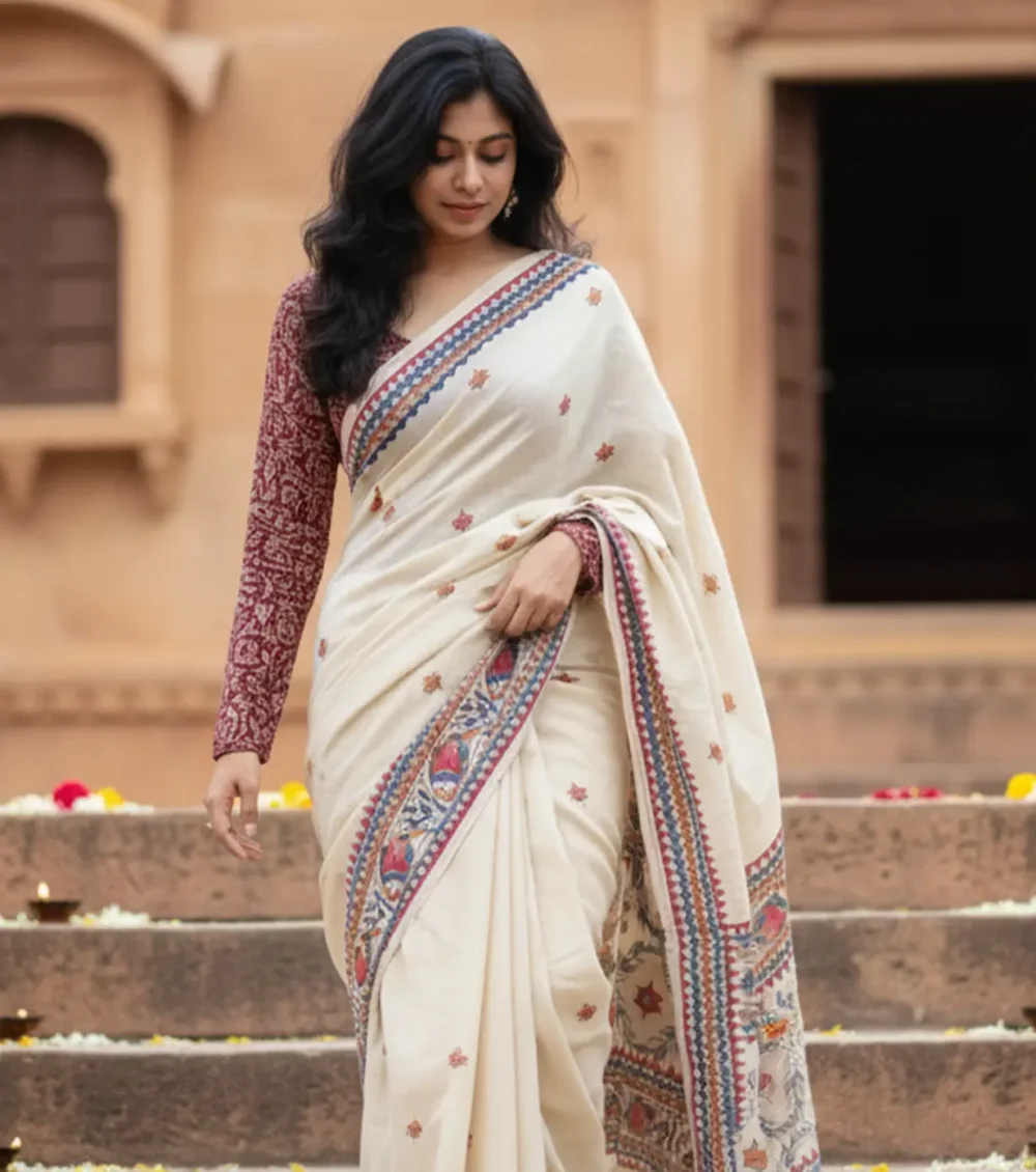 Graceful and artistic, this ivory saree in linen fabric features intricate folk-inspired borders and delicate motifs. The breathable texture ensures comfort while draping beautifully. Perfect for festive occasions or cultural gatherings, it blends traditional craftsmanship with modern elegance for a refined and timeless appeal.