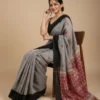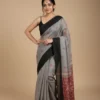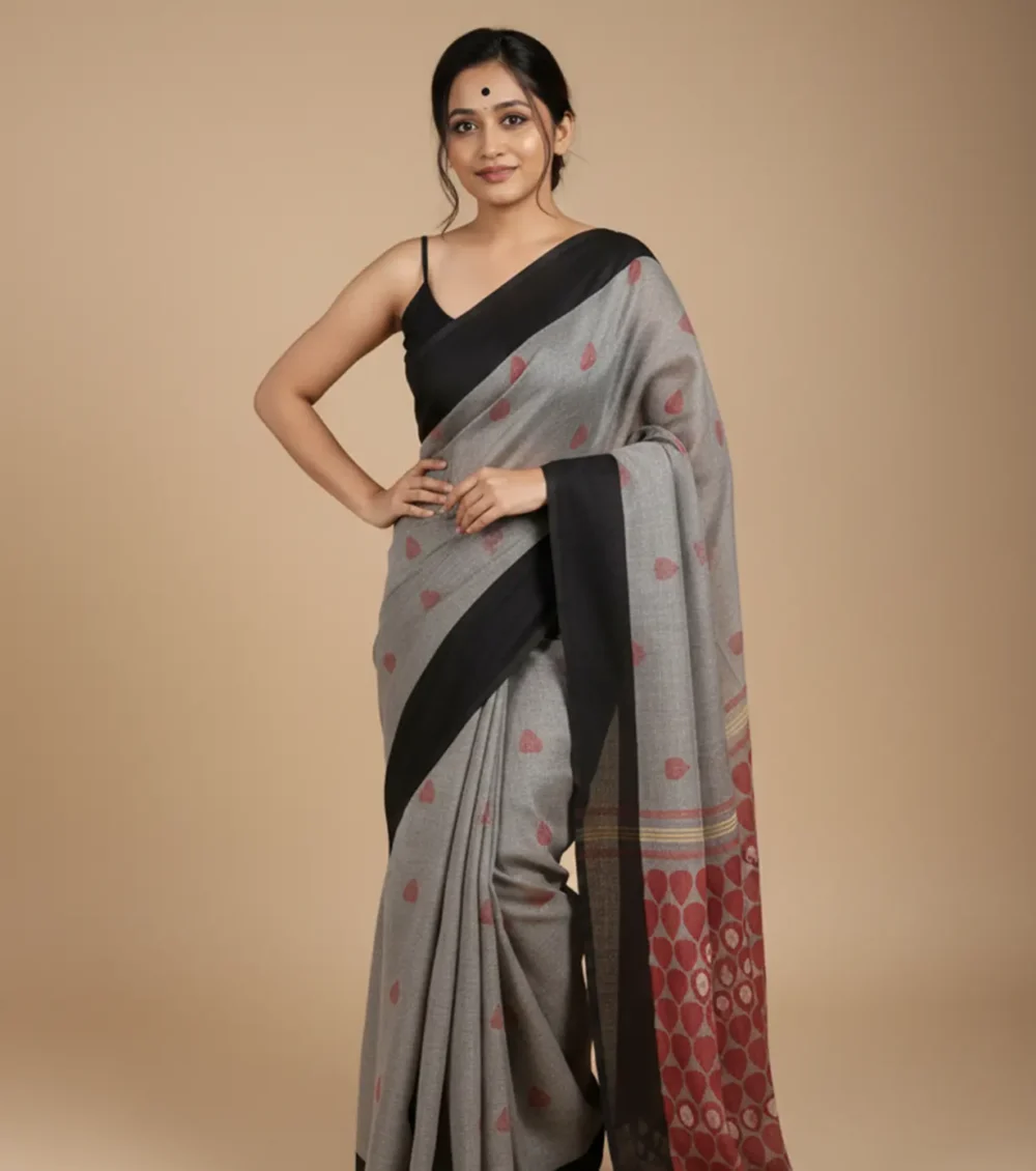 Chic and contemporary, this slate grey saree in linen fabric features subtle heart motifs and a bold black border for a striking contrast. The breathable texture ensures comfort while draping gracefully. Perfect for modern styling or casual elegance, it blends minimal design with a playful, stylish edge effortlessly.