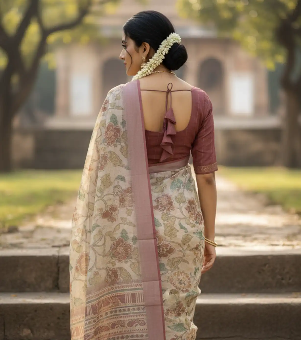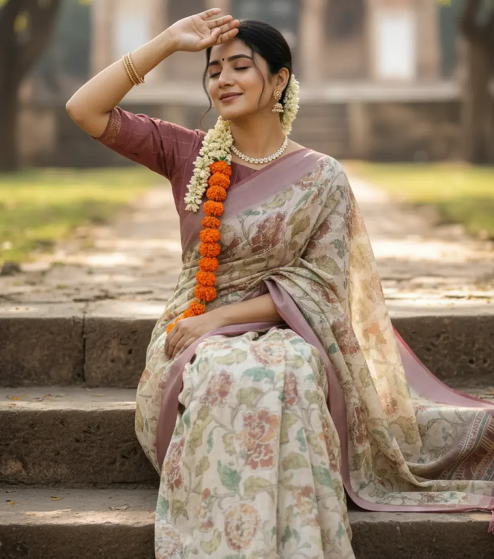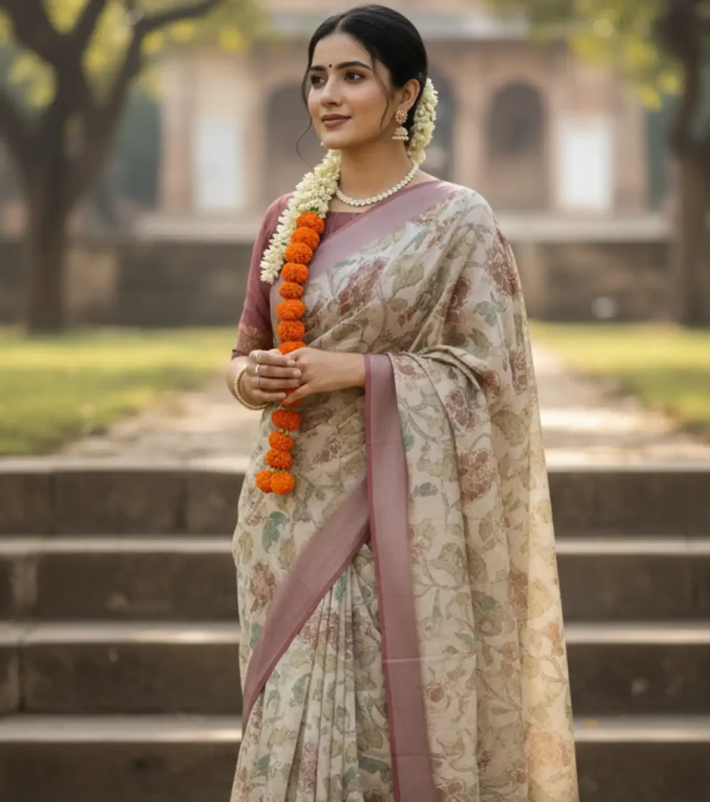Elegant and timeless, this vintage floral saree in linen silver lining fabric features soft pastel tones and delicate detailing. The breathable texture ensures all-day comfort while draping beautifully. Perfect for festive gatherings or elegant daywear, it blends heritage charm with a subtle shimmer for a refined look.